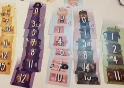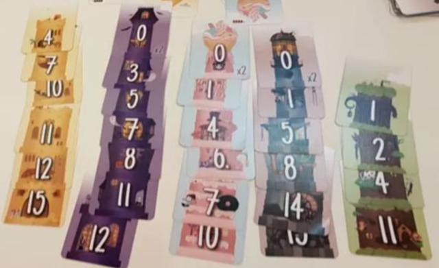 Voor 2 tot 3 spelers is er voor elke kleur toren een kaart van 0 tot 15.