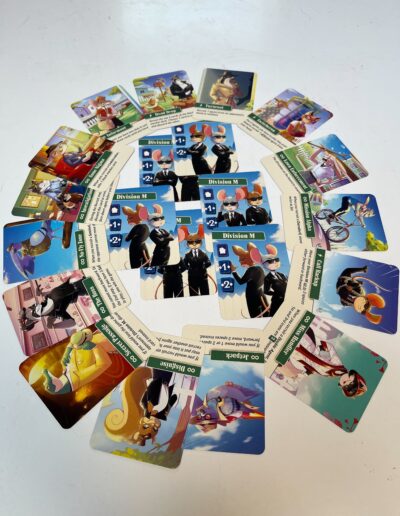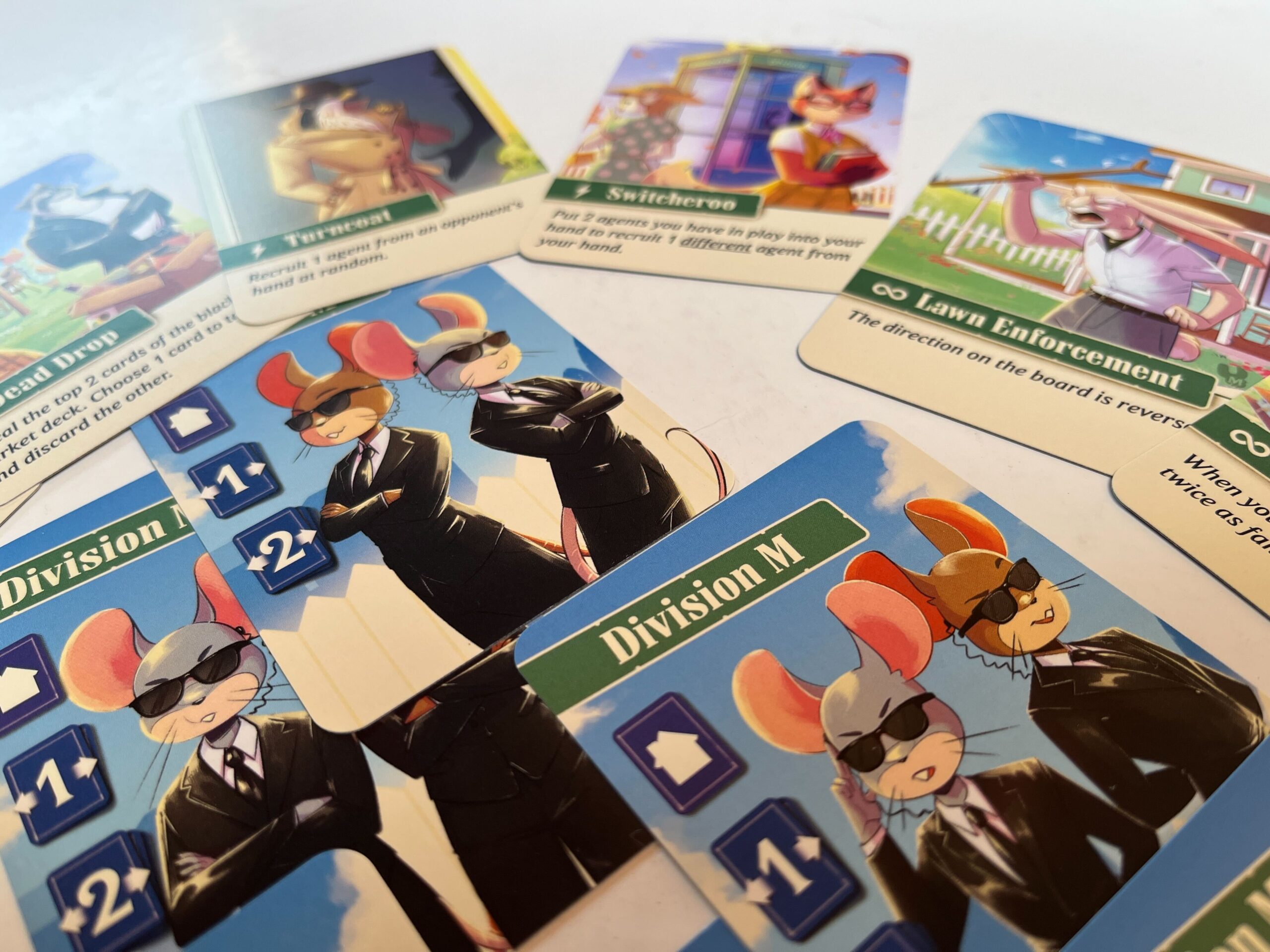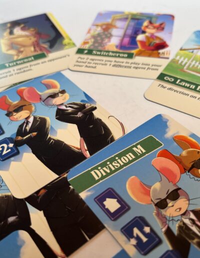 The game still follows the same principle where a player offers 2 cards, 1 visible and 1 invisible, but with specific cards an extra meeple can come into play to increase your chances of winning. As soon as your Division M meeple is on the exact same space as your opponent’s spy, you have won the game. New cards that can move your Division M meeple are coming into the rotation, but a number of new “black market” cards are also being added to generate more impact.