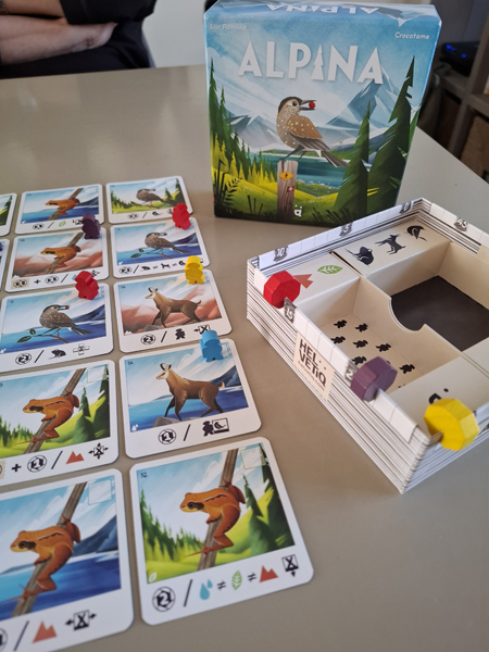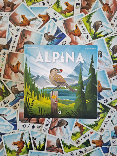 Verder is Alpina een heel vlot, eenvoudig te begrijpen spel. What you see is what you get. Niet te veel regels, geen uitzonderingen, gewoon rechttoe rechtaan. Hier moet ook gezegd worden dat het spel heel vlot speelt omdat de iconografie zo overduidelijk is. Chapeau hiervoor, want dat is niet in elk spel het geval. Het artwork had op zich wat aantrekkelijker gekund door mooie, unieke tekeningen van de notenkraker, de bruine kikker en de gems te gebruiken in plaats van de 3 simplistische, gestileerde tekeningen die nu telkens terugkomen. Op zich is dat niet storend voor het spel, maar het is gewoon minder aantrekkelijk hierdoor. Het oog wil toch ook wat, niet? Wel een leuk folietje: de rand van het doosje fungeert als scorebord!