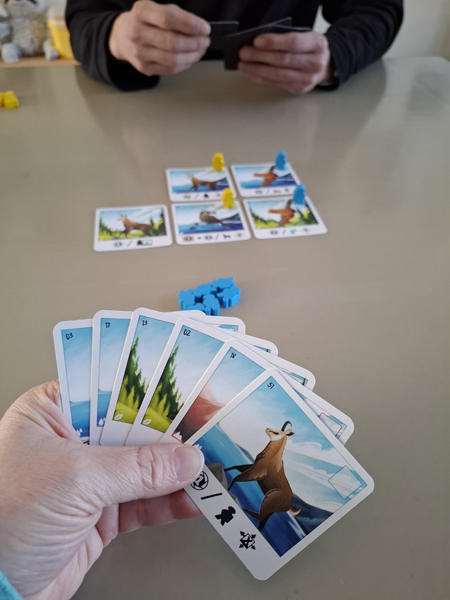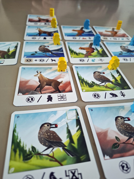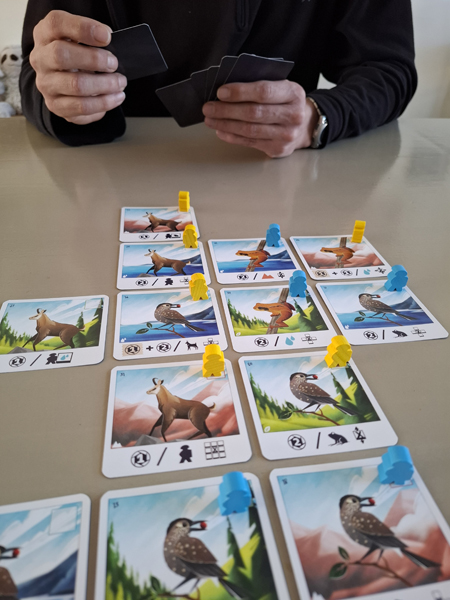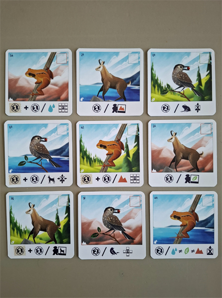 Alpina is played with 56 cards. Each card depicts one of the three animal species (chamois, frog or nutcracker) and one of the three landscapes (mountain, forest or lake). Each card also shows how you can score points with this card if you were to place a hiker on it. At the start of the game, one random chamois card is placed in the middle of the table. This is the start of what will eventually become a common 5×5 grid of cards. Each player receives six cards. The remaining cards form a draw pile. Each player also receives a number of hikers in their player colour (the number depends on the number of players). Starting with the first player, players take turns clockwise. When it is your turn, you do the following three things in this order: