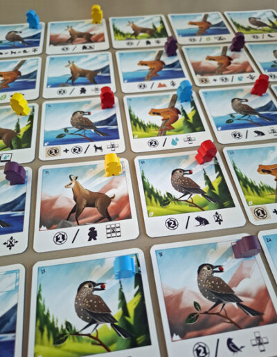 Alpina ends when the 25th card is placed in the grid. Now the scores are determined. The rulebook clearly states how you score points for each card. The iconography is very clear in this. The nutcracker always scores points for other animal cards in the grid. The chamois scores points based on hikers. And the frog scores points based on landscape cards in the grid. Add up the points of each of your hikers. The player with the highest total score wins Alpina!