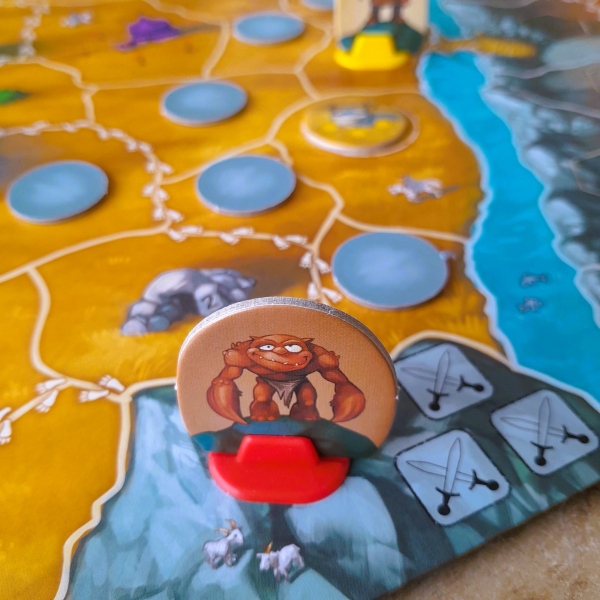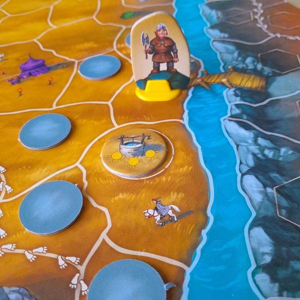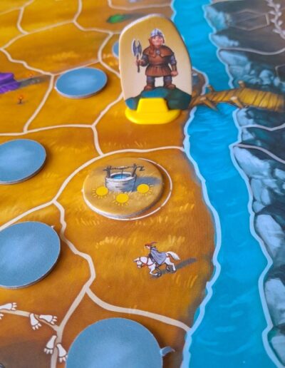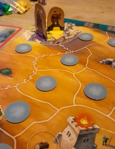 During the day, the players can walk across the board. They can collect tokens, fight with buntings or buy goods. Each step taken costs one sun token. When you have used up all your sun tokens, the hero goes to sleep. Other players can continue until every player is asleep and night falls.