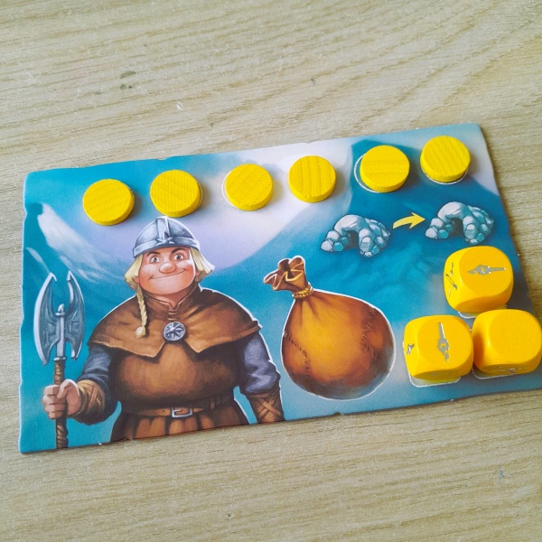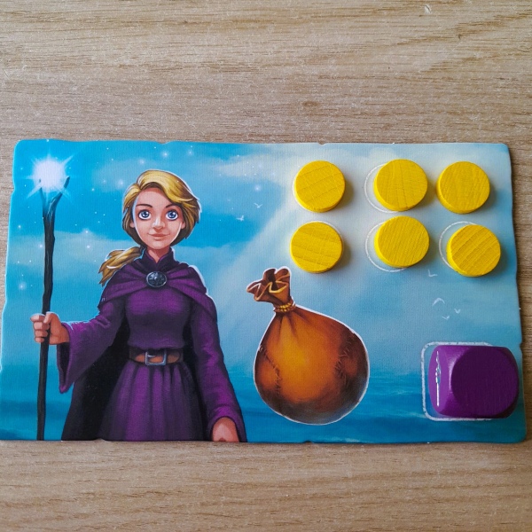 Each player has chosen a hero and these heroes all have their own characteristics. Each hero has a certain number of sun disks and dice. What is written on the dice and how they are divided among the heroes is therefore also different. The dwarf, for example, has the special power of being able to walk through tunnels, which allows him to travel greater distances across the board for one energy (solar disk). The wizard does not have any weapons on his dice to defeat Bunting, but he does have a magic spell with which he can defeat Bunting.