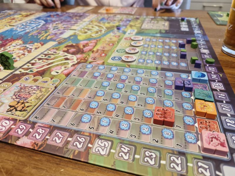 What I often notice as a worker-placement fan is that it’s very easy to work past each other in this type of game. You can hinder each other by holding down a spot or to reach a goal earlier, but otherwise, you can play your own game fairly well. You only interfere indirectly. That’s not the case with Arborea. You have to focus on what your fellow players are doing. Because of the shared resources, the shared Creatures supply, for example. In these types of games, I often get away with observing what my opponent is doing and then running with the opposite strategy. In practice, this often means my fellow players focus on scoring during the game, while I play catch-up at the end because I score on the long-term goals. That split focus simply isn’t possible with Arborea. I was quickly disappointed. Attracting expensive cards for your Ecosystem is only possible with expensive resources. These don’t easily survive an entire round, and if they are already there, another player has probably placed them before you, so they haven’t used them themselves, thus gaining a lot of points and a head start. So you’ll want to try to acquire expensive resources and use them immediately in the same turn. But that often costs spirit, and you miss out on the points from the resources…