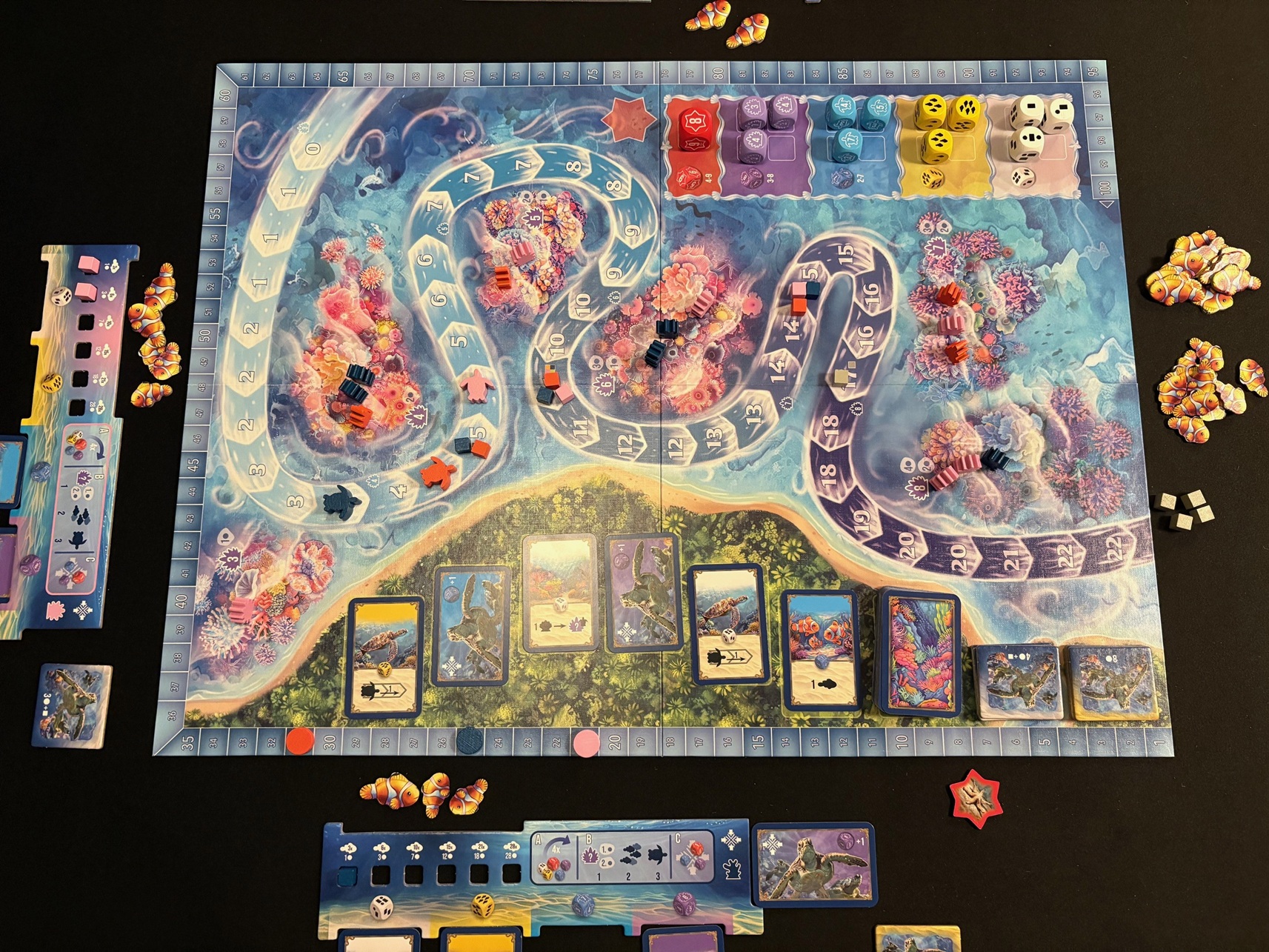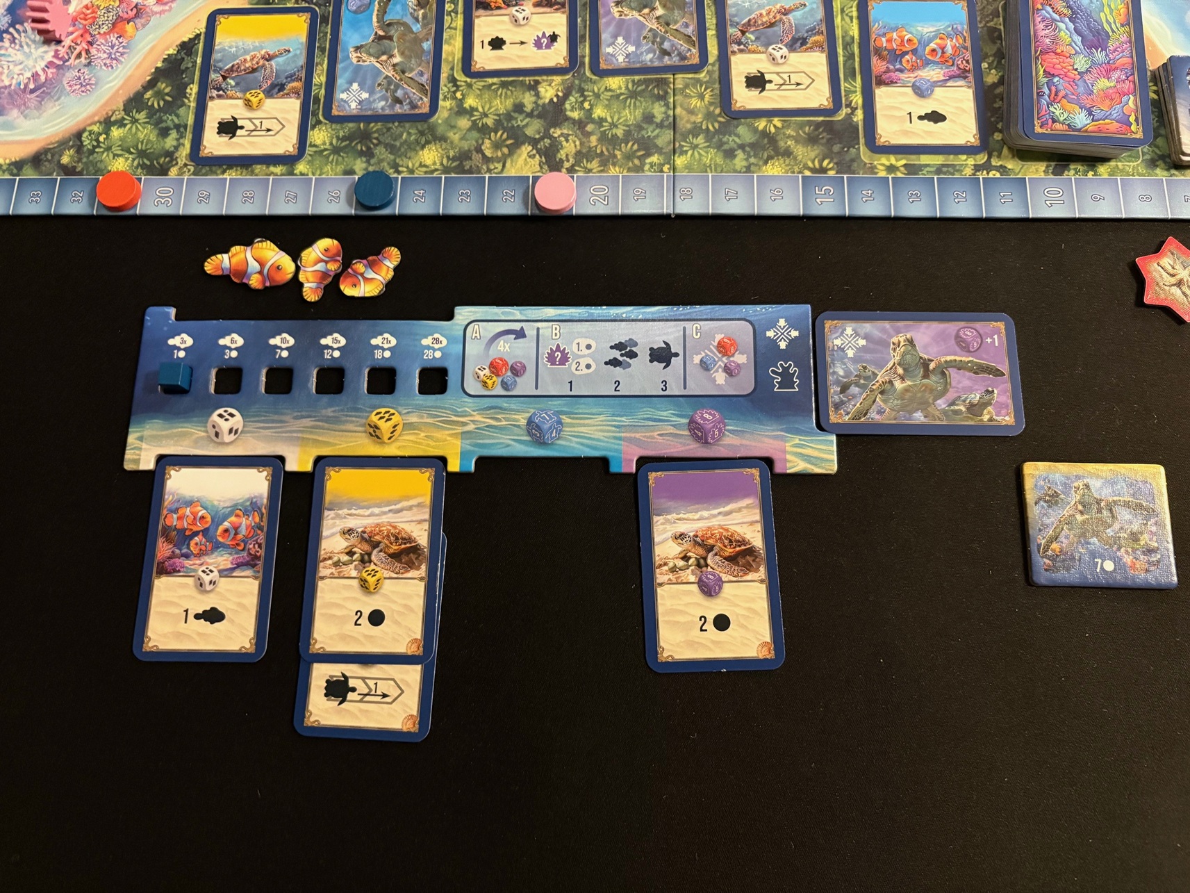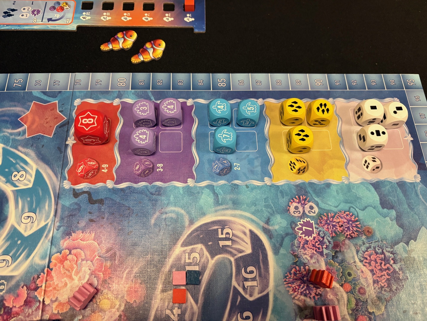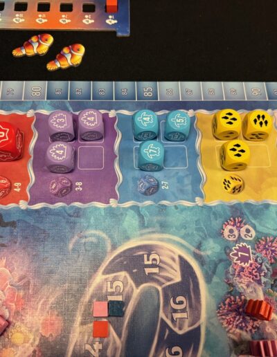 After each player has taken four dice, a scoring phase begins. In this phase, corals are scored based on who has the most tokens per colour in each coral area. Then fish are scored per player, provided there’s enough food, and finally the turtles score points based on their position on the track. Add everything up for an interim score.