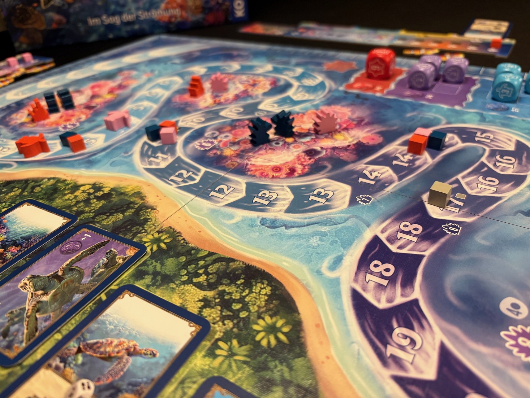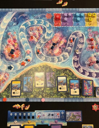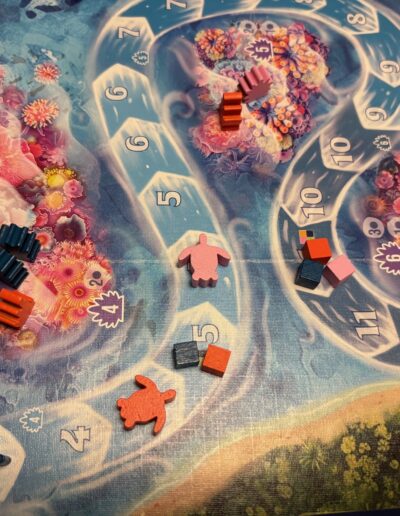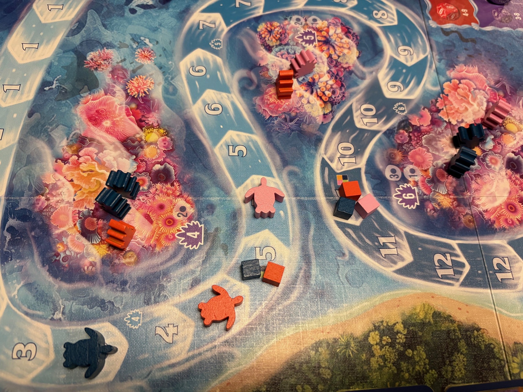 After each player has taken four dice, a scoring phase begins. In this phase, corals are scored based on who has the most tokens per colour in each coral area. Then fish are scored per player, provided there’s enough food, and finally the turtles score points based on their position on the track. Add everything up for an interim score.