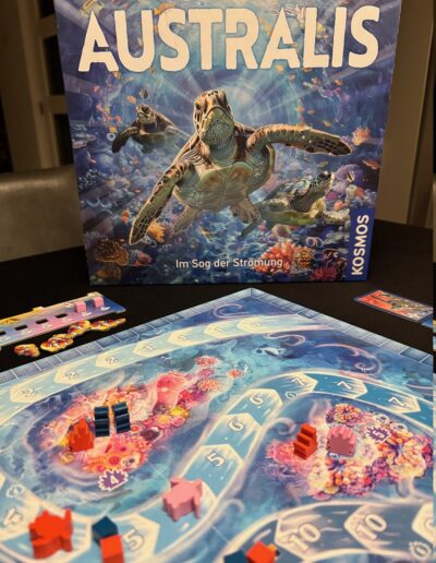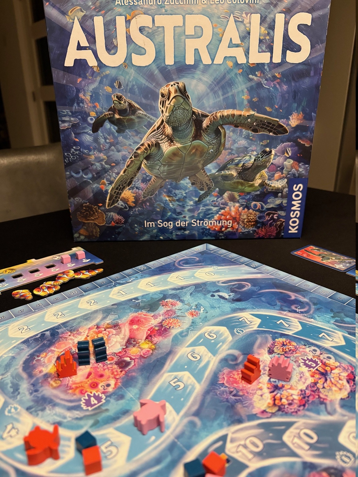 Er is een mooi hoofdboord met een groot slingerend spoor voor de schildpadden, een scorespoor langs de rand en diverse plekken voor dobbelstenen, koraalgebieden en kaarten. Verder krijgt elke speler een schildpad, voedselblokjes, koraalblokjes en scoresteen. Allemaal van hout. Er zijn nog clownvisjes van karton in 2 maten: de kleine zijn van waarde 1 en de iets grotere van waarde 3. Deze maten verschillen niet veel van elkaar, je moet goed opletten. De dobbelstenen in verschillende kleuren zijn met speciale symbolen voor dit spel gemaakt. Alles is van prima kwaliteit, ik had alleen de 2 soorten clownvissen iets onderscheidener gemaakt. De leeftijd van 10+ is wat overdreven, daar kan wel een paar jaar vanaf. Er zit veel interactie in het spel. Australis is met 3 of 4 spelers leuker dan met 2.