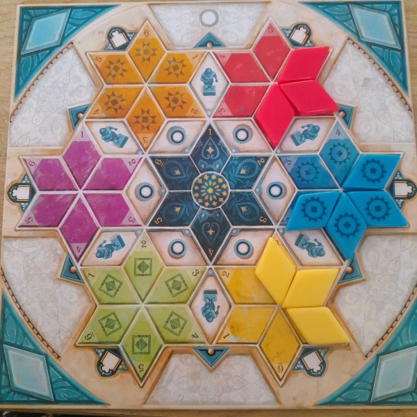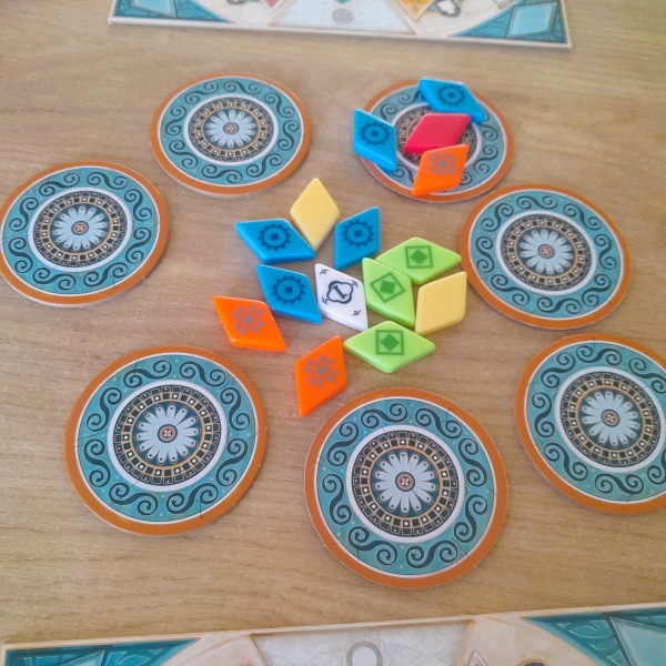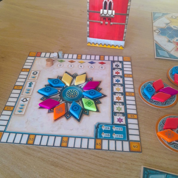 Tot zo ver het verhaal van het spel. En inderdaad; Het geheel ziet er kleurrijk (zomers) uit. Het geeft mij, misschien nog meer dan het origineel, het gevoel van een tegelvloer. De borden die erbij komen zijn van stevig karton en geïllustreerd met mooie afbeeldingen. Het geheel geeft wel echt een bepaalde sfeer af.