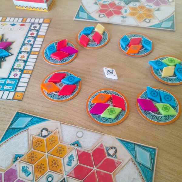 Just like in the “regular” Azul, players receive a player board, where you can choose between the colored side or the gray side, and depending on the number of players, a number of factory tiles are placed on the table. Four colored tiles are placed on each of these factory tiles.