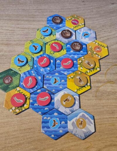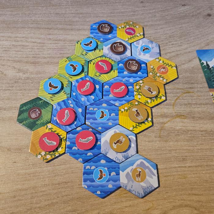 Each player takes a total of ten turns. At the end of the game, the habitats are scored. For every group of at least three matching habitats, the player may take a habitat photo tile. If a group contains six or more connected habitats, the player may take two habitat photo tiles.