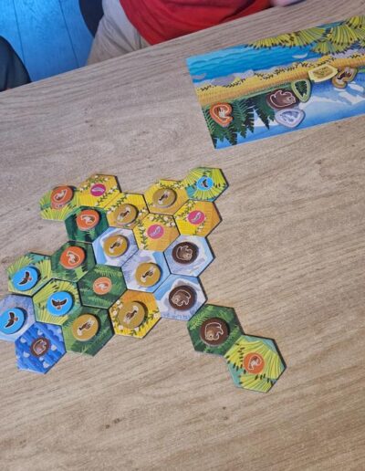 To be honest, I find it a bit difficult to determine the exact target audience for Cascadia Junior. For Leonore (6), a four-player game lasted just a little too long. A game takes close to half an hour, and about halfway through she clearly started to lose interest. She was perfectly capable of playing without help, but the attention span of a six-year-old just isn’t quite long enough for a four-player game.