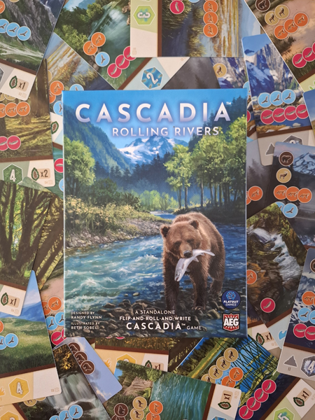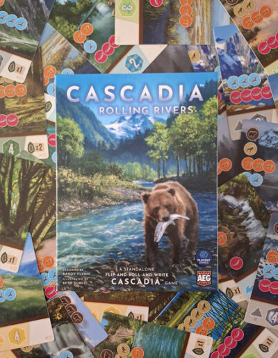 Een bordspel waarvan nadien een kaartspel, een roll & write of een flip & write wordt gemaakt. Meestal ben ik geen fan en vind ik dat dan een flauw afkooksel van het origineel. Maar voor Cascadia Rolling Rivers maak ik graag een uitzondering. Wat meer is: de bedenker, Randy Flynn, die ook het originele bordspel bedacht, maakte er zelfs een roll & flip & write van! Hetzelfde Canadees-Amerikaanse ecosysteem van landschappen en dieren verschijnt ook hier weer, maar het spel is echt he-le-maal anders dan het bordspel. Hetzelfde thema, maar geen flauw afkooksel dus!
