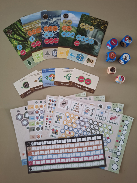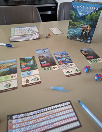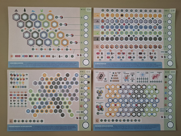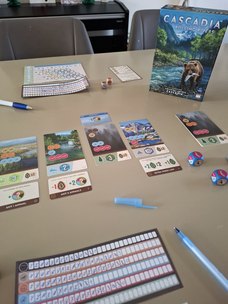 In de doos van Cascadia Rolling Rivers zitten 2 blokken met invulblaadjes: de omgevingsblaadjes en de dierenblaadjes. Op je dierenblaadje hou je bij hoeveel dieren je op elk moment in het spel van elke soort ter beschikking hebt. Met de beschikbare dieren kan je dan habitatkaarten scoren die je dan weer invult op je omgevingsblaadje. Er zijn 4 verschillende omgevingsblaadjes met elk een andere moeilijkheidsgraad en lichtjes andere invul- en scoreregels. Die regels worden allemaal, blaadje per blaadje, duidelijk uitgelegd in de spelregels. Aan het begin van Cascadia Rolling Rivers wordt gezamenlijk bepaald met welk omgevingsblaadje er gespeeld zal worden.