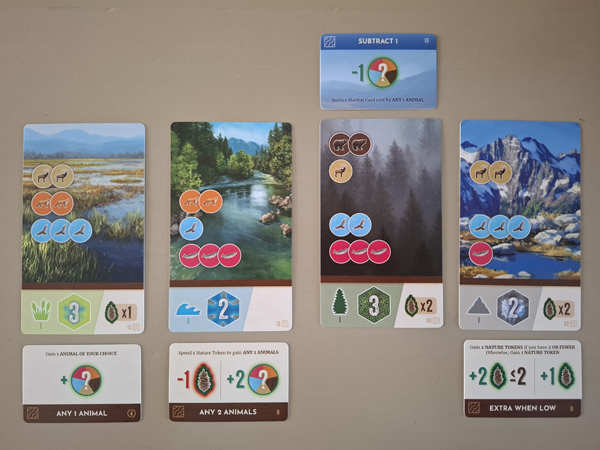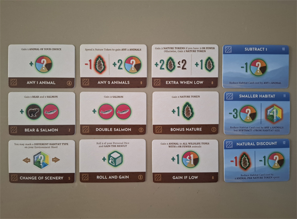 Je hebt dus 4 rondes de tijd om de juiste dieren te verzamelen voor een bepaalde habitatkaart. Maar eens dat gelukt is, is de volgende kaart daar alweer. Het is dus een constant afwegen van welke habitatkaarten je graag wil scoren en welke kaarten je zal overslaan. Je kan ze immers niet allemaal vervolledigen, daar heb je gewoonweg niet genoeg dieren voor. De kunst is om dan die kaarten te vervolledigen die jou de meeste punten opleveren of de interessantste bonussen. Een fijne puzzel dus voor mensen die een kleine geluksfactor wel fijn vinden en die toch een beetje kunnen plannen en vooruit denken. Leuk!
