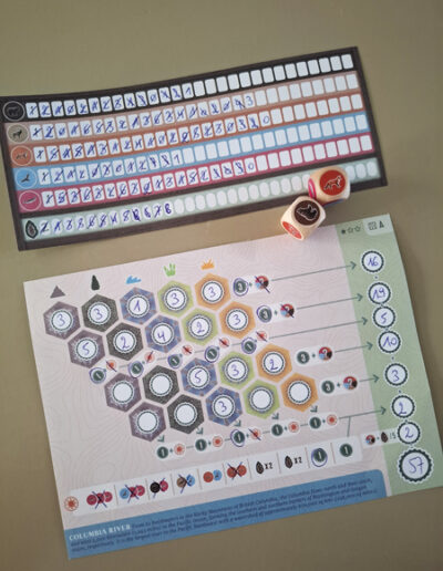 A board game that is subsequently made into a card game, a roll & write or a flip & write. I am not a fan and usually find it a bland copy of the original. But for Cascadia Rolling Rivers, I gladly make an exception. What’s more: the creator, Randy Flynn, who also created the original board game, even made it a roll & flip & write! The same Canadian-American ecosystem of landscapes and animals reappears, but the game is really com-ple-tely different from the board game. Same theme, but not a bland copy!