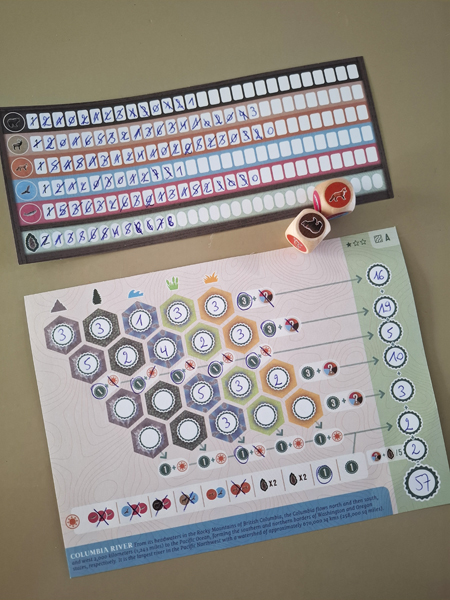 In essentie zijn alle roll & write spellen min of meer gelijk: je rolt dobbelstenen, doet daar wat mee, vult iets in, verzamelt bonussen en punten en als je het wat goed speelt, dan kan je combinaties maken die je beurt wat extra glans geven. Tot dusver niets speciaals. Maar in Cascadia Rolling Rivers vind ik toch dat er nog wat extra in zit. Eerst en vooral heb je bij het verdienen van bonussen op je omgevingsblaadje meestal zelf de keuze welke bonus je ontvangt (er zijn een aantal bonussen, maar je kiest zelf in welke volgorde je ze wenst te ontvangen). Aan jou om de juiste bonus op het juiste moment uit te kiezen.