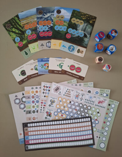 Besides these 2 fill-in sheets, each player also receives 2 different personal dice and a handy overview card. There are also 4 common dice: 3 animal dice and 1 special action die. The habitat, bonus and discount cards are set up according to the rulebook. In Cascadia Rolling Rivers, all players take their turn at the same time and the game is played in 20 rounds. After these 20 rounds, the scores are counted and the player with the most points wins! A round goes as follows: