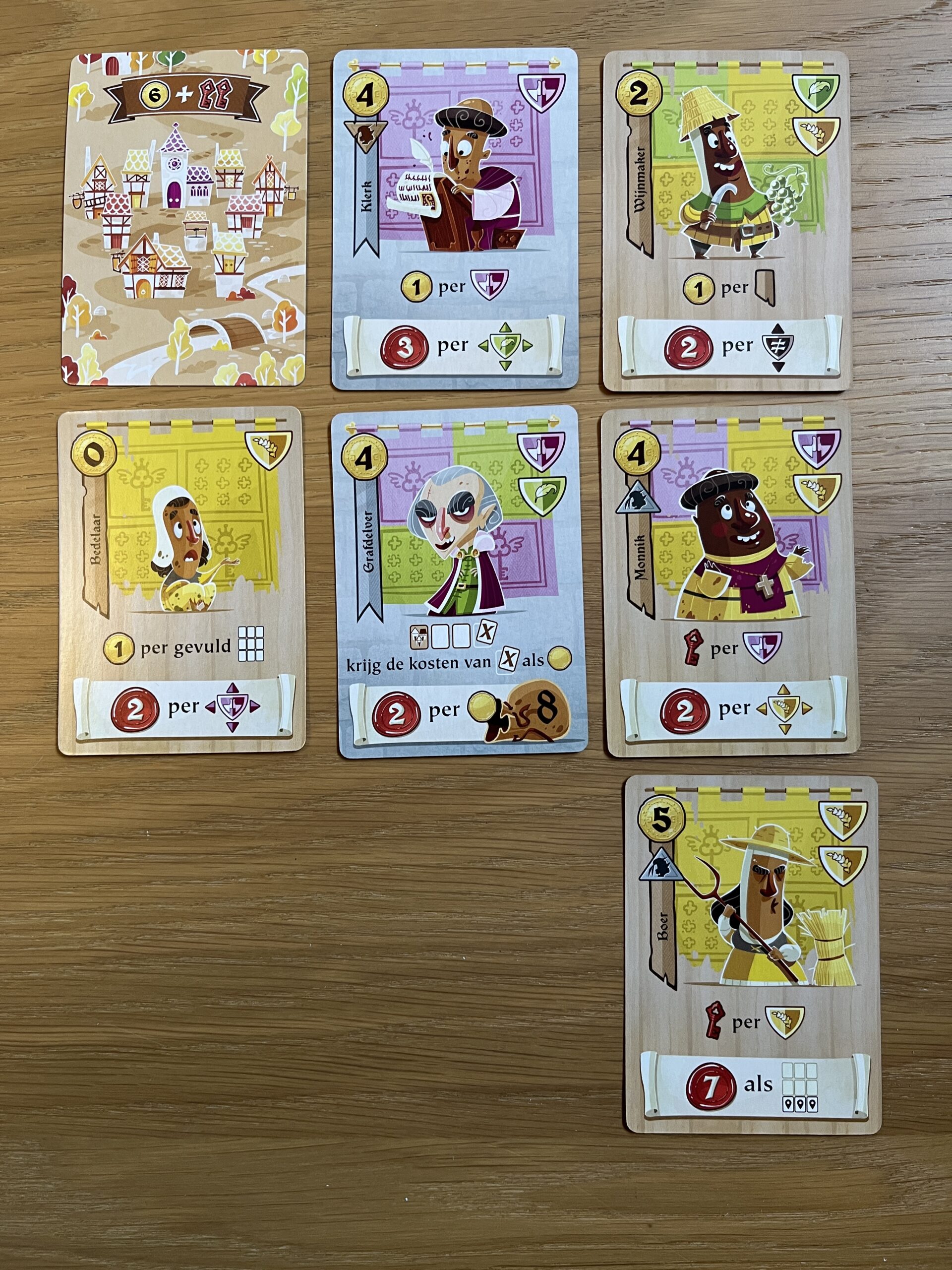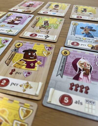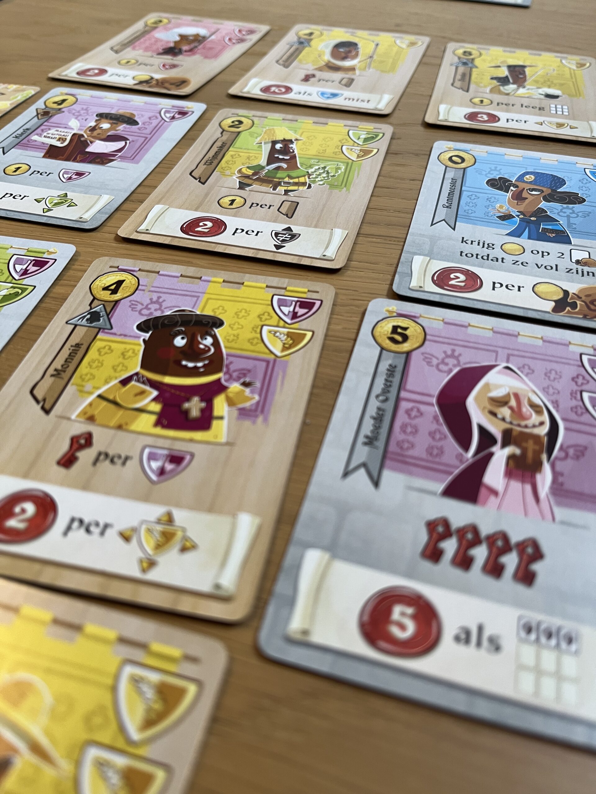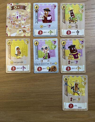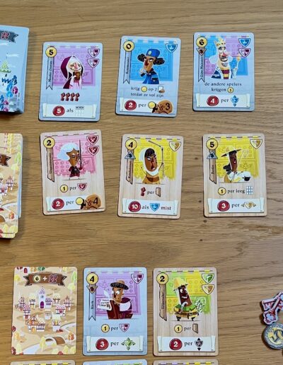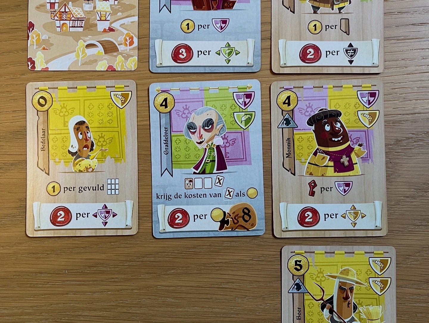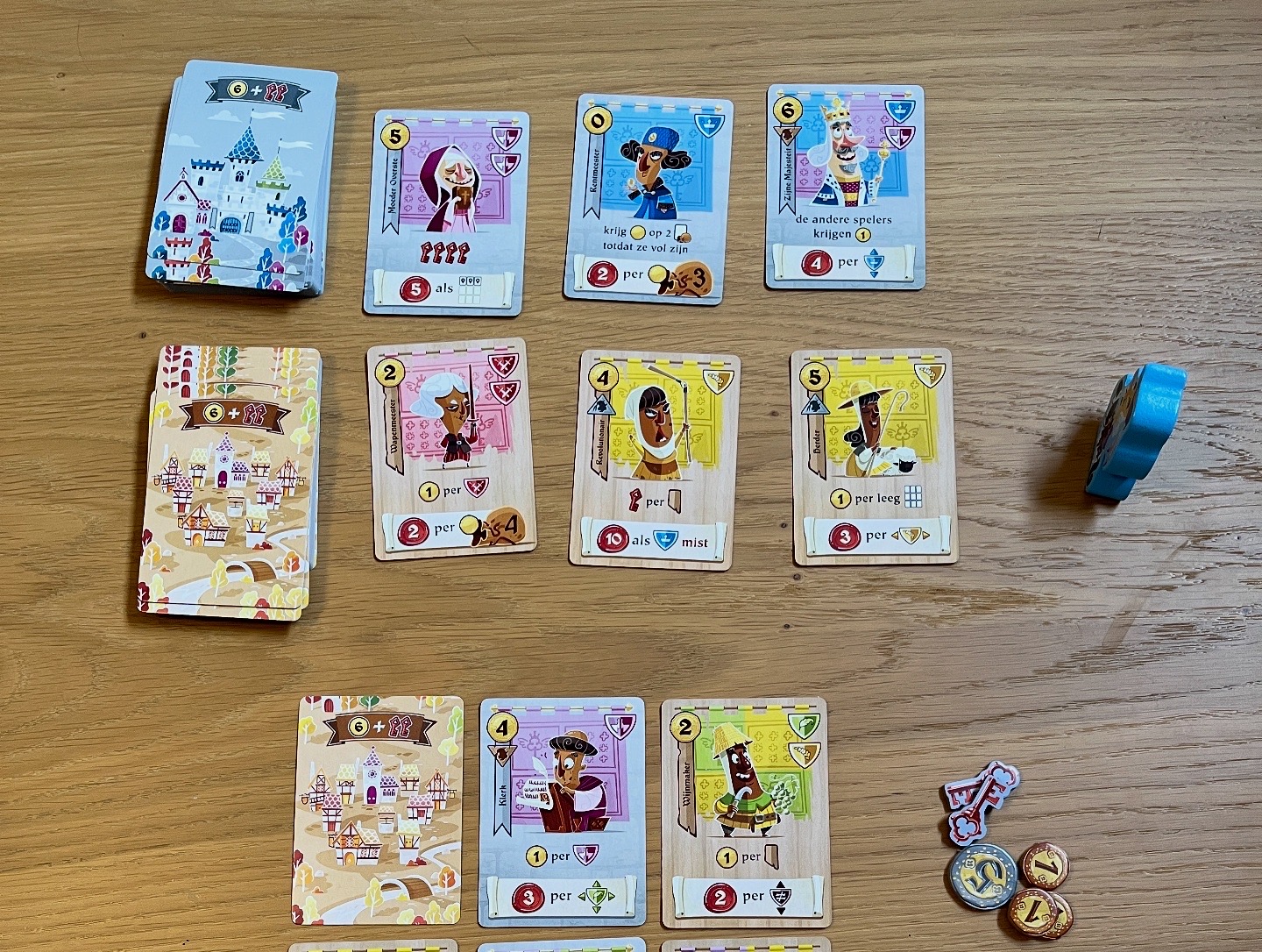 Elke beurt neem je een karakter uit de kasteel- of dorpsrij waarna je deze kaart in je eigen tableau legt. Je betaalt deze kaarten met je muntjes. Elke kaart behoort tot een bepaalde klasse met een wapenschild zoals bijvoorbeeld boeren, militairen, edelen… Hierop staan allerlei scoringsmechanismes om op die manier zoveel mogelijk combo’s te maken. Sommige kaarten geven aan dat je een bepaald aantal punten per wapenschild in die rij/kolom krijgt. Andere kaarten hebben een geldbuidel waarop je doorheen het spel munten kan opleggen die dan bij de eindscore punten zullen opleveren.