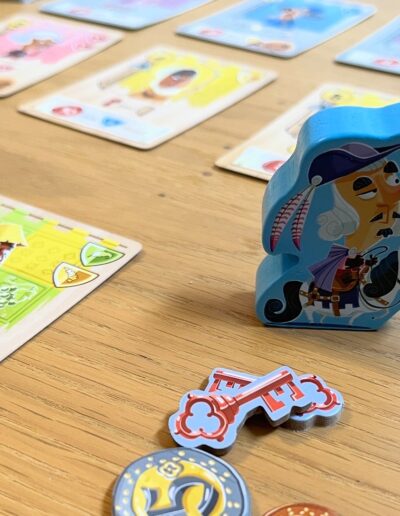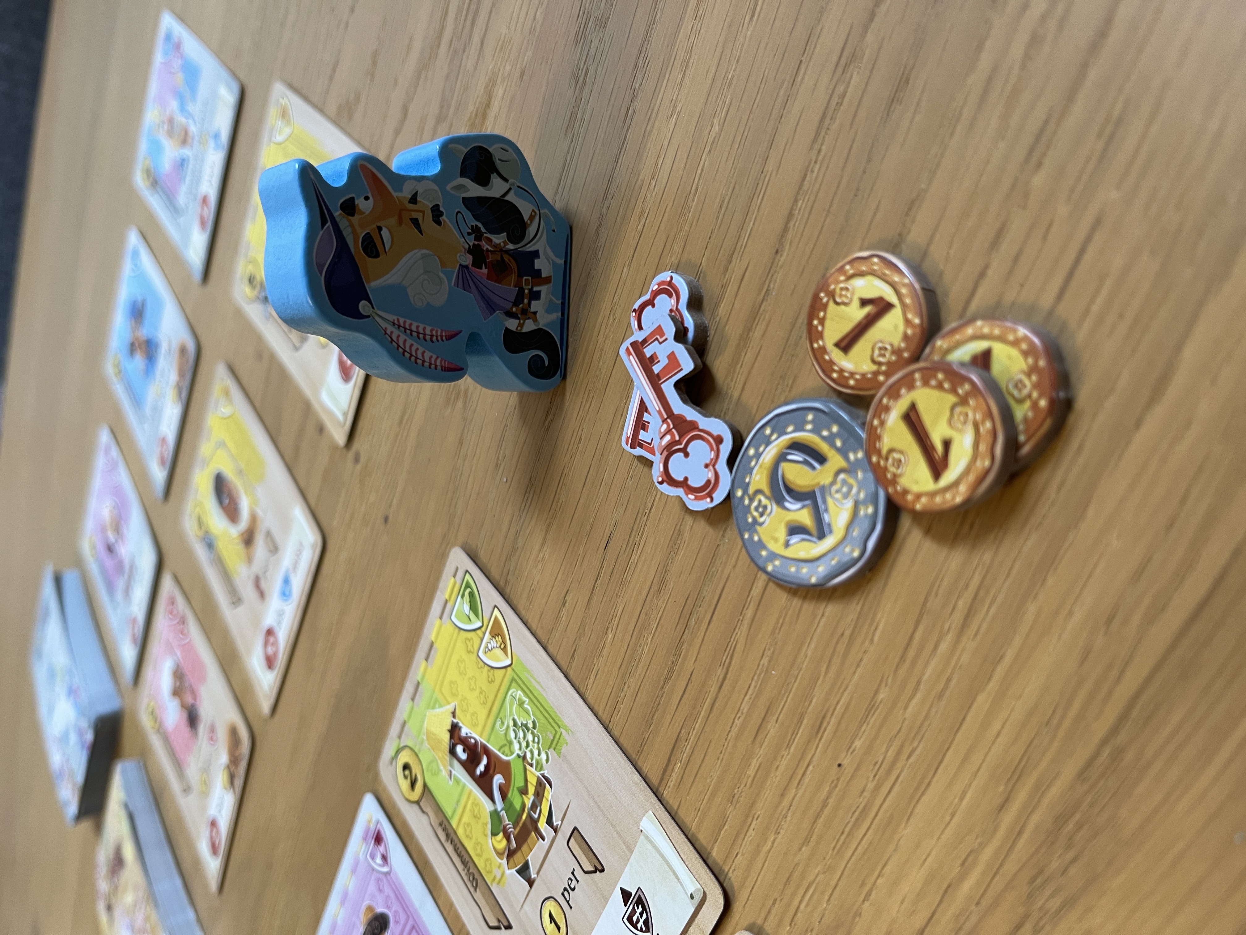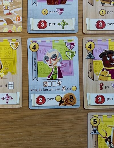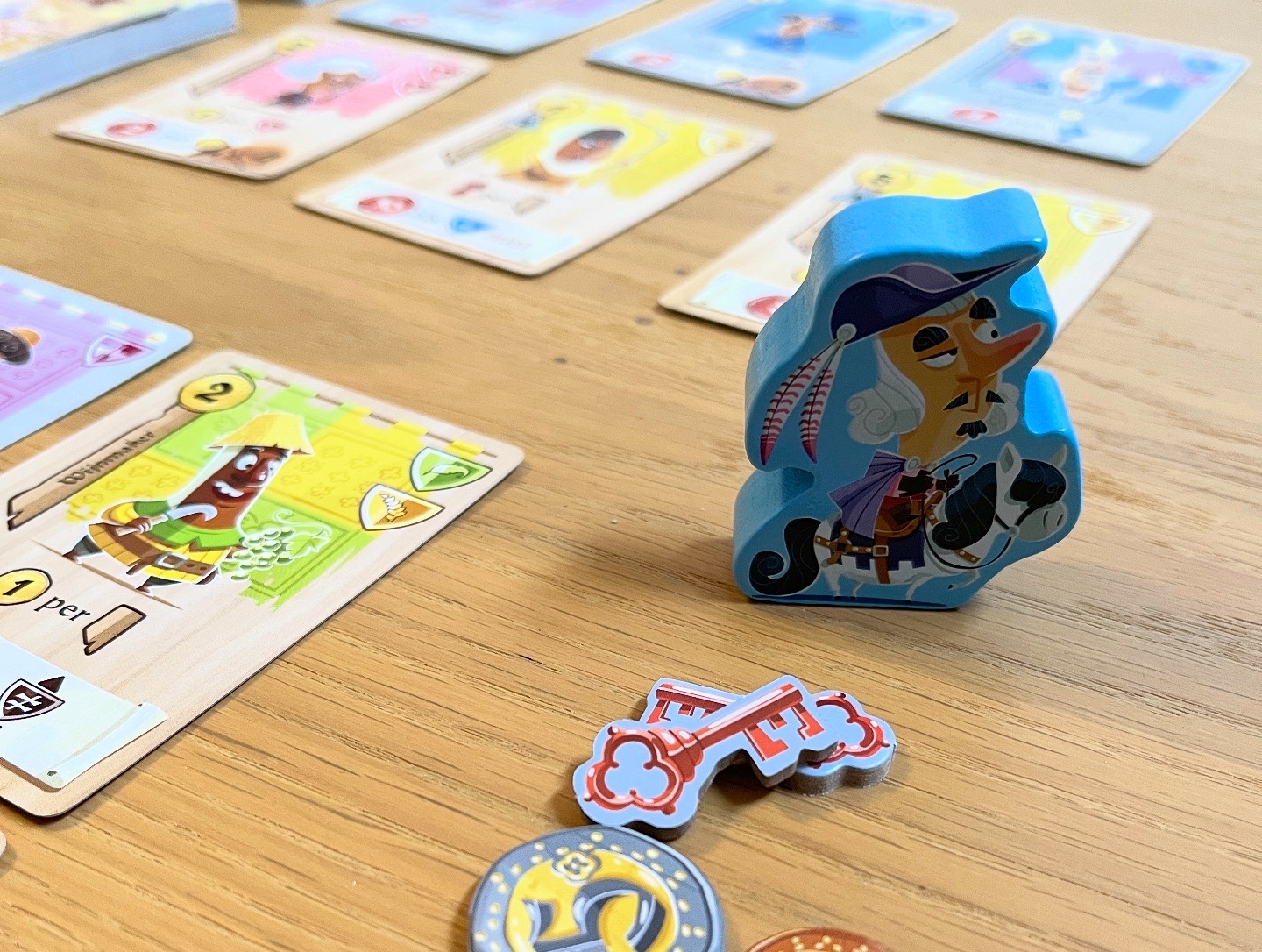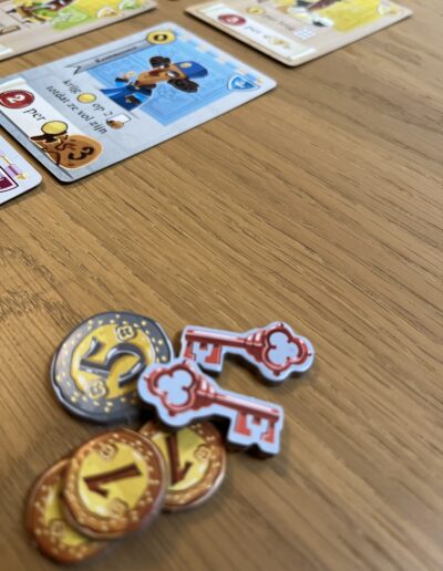 The goal of the game is to score as many points as possible by making powerful combinations of all these characters. You start the game with two keys and 15 coins to perform various actions or buy cards. The game ends when everyone has completed their 3×3 tableau, and then we look at the points. Each row of the market consists of three cards. The top row is the castle row, and the bottom row is the village row. There’s also a messenger standing at each row, indicating which row you can buy a card from. Before buying a card, you can choose to use a key to replace the market row or switch levels. The cards not only have end-of-game properties but also properties that grant you coins or keys when you place them in your tableau. If you can’t or don’t want to buy anything, you can always place a face-down card in your tableau, earning you six coins and two keys. Unfortunately, this card won’t yield any points at the end of the game.