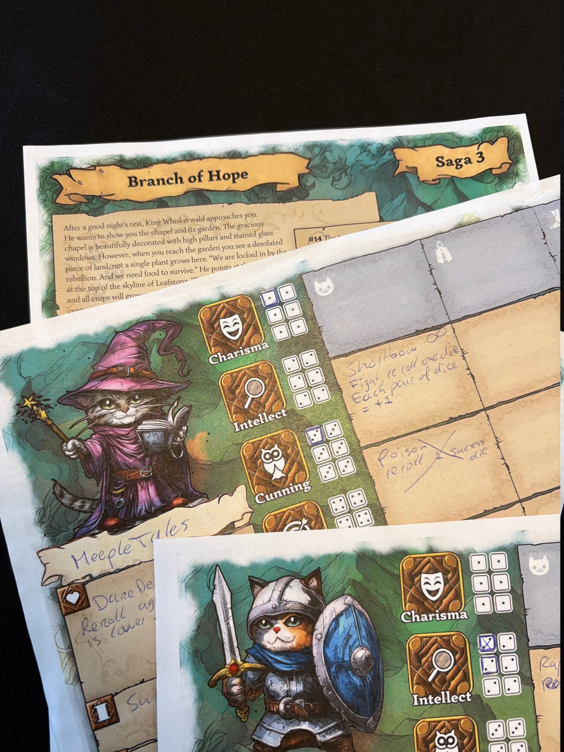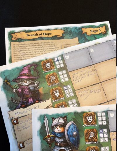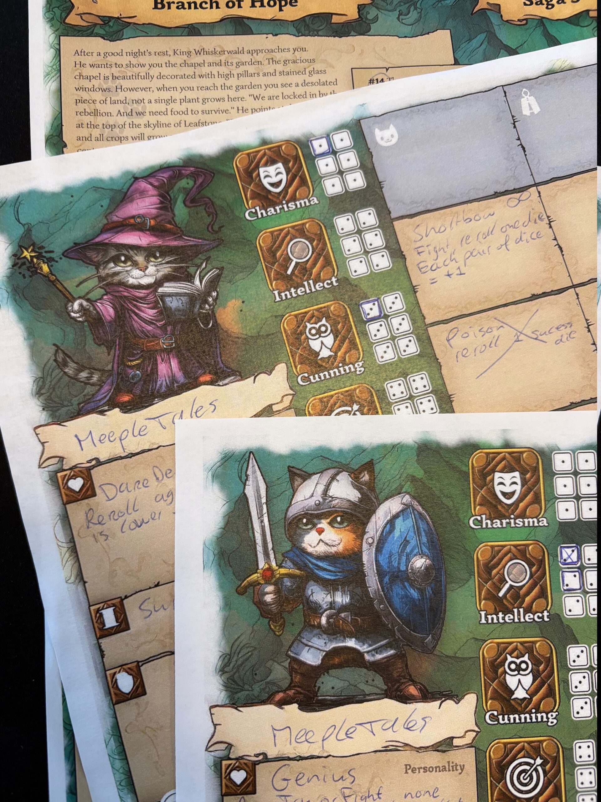 This is one of the first real print and play games I’ve played. I wasn’t very enthusiastic at first and found assembling the cat a lot of work before I could even start. But as I got into the stories, I became more enthusiastic. The texts are very short, sometimes even too short. I actually find that quite pleasant. The game doesn’t keep stopping for a long time to read a large piece of text. Sometimes, for the experience, it could be a bit longer. I find the length of Sleeping Gods, for example, ideal. The stories themselves are nicely written and easy to follow. Because it is a print and play with a pen and dice, you pick it up very easily. You can even play it perfectly fine on the couch in the sun. That is a big advantage. After playing a story a few times, you know how the story is structured and you won’t play it again. Unless you keep making different choices. In the campaign, you go through 5 stories, but there are more stories available. You progress through specific stories based on your choices, and if you choose differently, you get different stories. The game is in English, and if that is not a problem, families can play this well. I think the age rating of 9+ is a bit high. Slightly younger children can play this as well. Another narrative game aimed at children is Toriki, which requires you to make more strategic choices and is for ages 8 and up. Cat Saga is very accessible to play and makes a fun adventure.