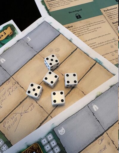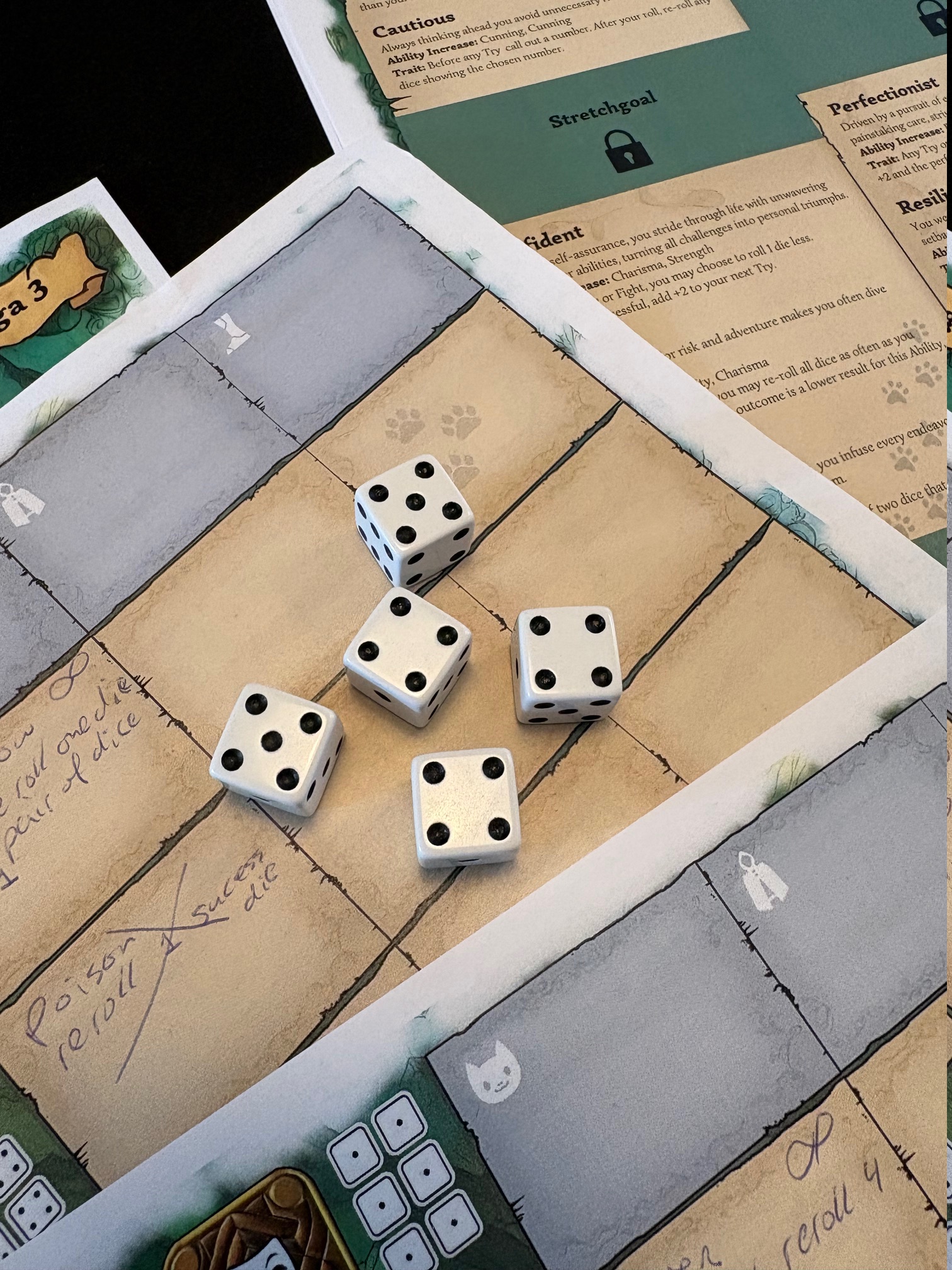 You start by reading the short introduction to the story and proceed to number 1. For each number, you read a few sentences and make decisions about how you want to proceed. Sometimes you have to choose between 2 actions, where each action refers to a different number. Sometimes you have to take a test or fight. During a test or fight, the dice appear and you roll the 5 dice. The outcome must be a set of matching digits, which you can still manipulate using your character trait and items/spells you can deploy. The outcome can, of course, be successful or unsuccessful, and each outcome refers to a new number in the story that you look up and read. This is how you progress through the story and eventually reach the end. It is possible that you did not see certain sections of text at all; this is due to the choices you made and/or the results of tests and fights. You could play the story again with a different assembled cat and different choices; you would then get a different experience. The stories aren’t super long, about 45 minutes.