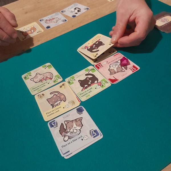 Rangschik de katten (kaarten) om een kloppend raster te krijgen en zoveel mogelijk punten te scoren.