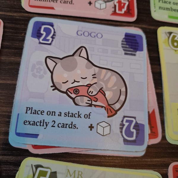• Cards may be placed on top of other cards, unless the meeple is on this card.
