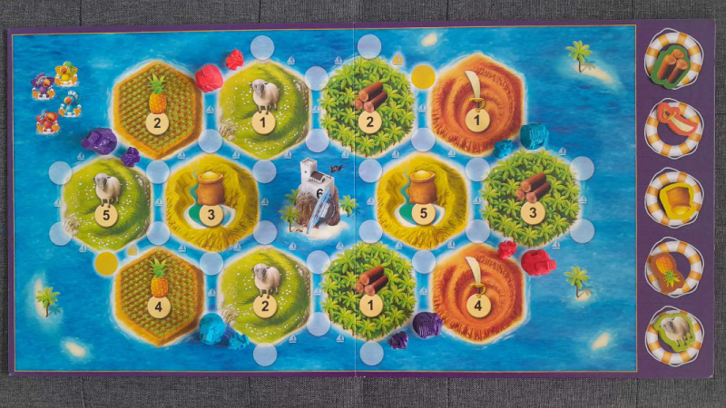 Each player starts by placing 2 forts and 2 boats, in predetermined locations. Then play takes turns. You roll the die first. All players who have a fort near an island with the number thrown get a resource (in this game these are; swords, wood, sheep, pineapple & gold).