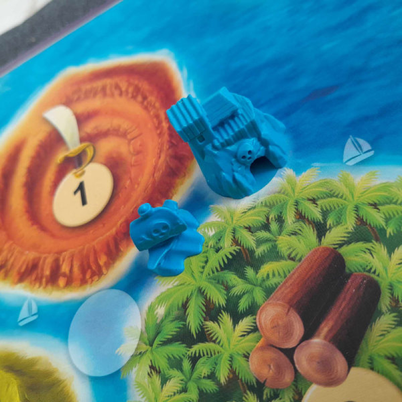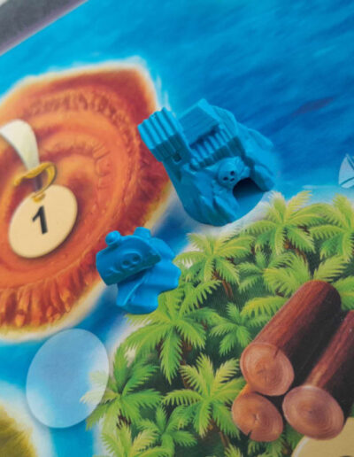 Except if 6 is rolled, then Captain Hook may be moved. You place Captain Hook on an island of your choice and may take one resource from the pot. When the number of this island is rolled again later, the players who built their forts here unfortunately do not get any resource(s).