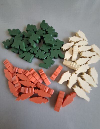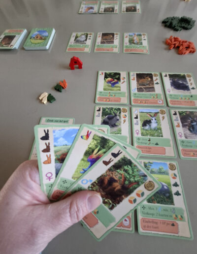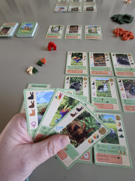 I also found it not easy to get the necessary resources to play out rabbits. On top of that, you could score points by collecting resources on cards, but those are the same resources you can play rabbit cards with. And because resources are already scarce, no one ever ended up with resources on cards. You can also sell cards from your farm to get resources. But then again, the frustrating thing is that if one player doesn’t do this, this player is guaranteed to have 9 cards in his play area, ending the game before you even get close to a full farm.