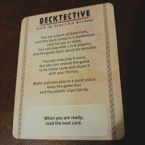 Decktective: Lock up Sherlock Holmes is een detective. De naam zegt het al; Het spel bestaat enkel uit een deck kaarten. (Oké, en een paar paperclips…) Naast dat deck kaarten is er dus ook geen handleiding. Alles wat je moet weten, staat op de kaarten beschreven. Je begint simpelweg bij het lezen van de eerste kaart, je volgt de aanwijzingen en zo ga je door de stapel kaarten. Het is dus een detective, je probeert het mysterie op te lossen. Het spel is dus maar eenmalig te spelen, maar ook erg gevoelig voor spoilers en dergelijke. Vandaar dat ik maar heel weinig foto’s heb gemaakt en ook weinig over het verloop van het spel vertel.