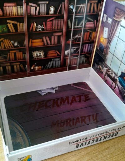 Decktective: Lock Up Sherlock Holmes is a game that really has to suit you. It is a detective, escape-room-like game. Not everyone likes it. Playing it at the games club may not be the best plan. But it is at home; alone, with your partner or friend(s). A good knowledge of English is essential, because everything is in English, including the deeper layers and such. But if you like these kinds of games, Decktective: Lock Up Sherlock Holmes is an excellent choice. The whole thing is incredibly narrative, so you really get sucked in. The design and artwork complete the experience. It all fits together perfectly, which contributes enormously to the atmosphere. I also think that the cards are used in a very creative way. Most of them ‘simply’ consist of clues in the form of text or images. But (as you can see in the photos) you can also build a crime scene with the cards, and there are a number of other original applications.