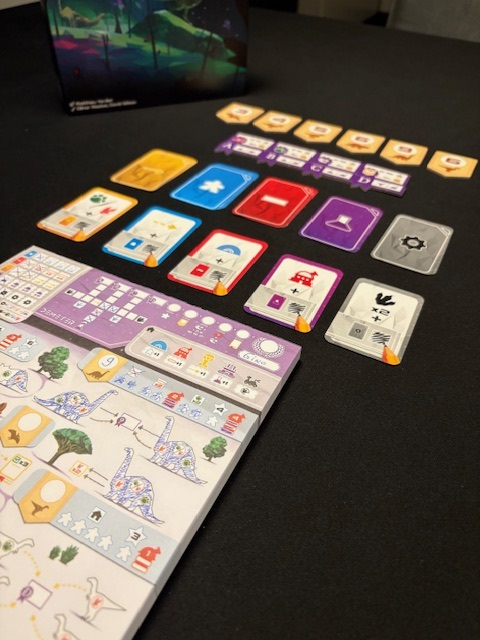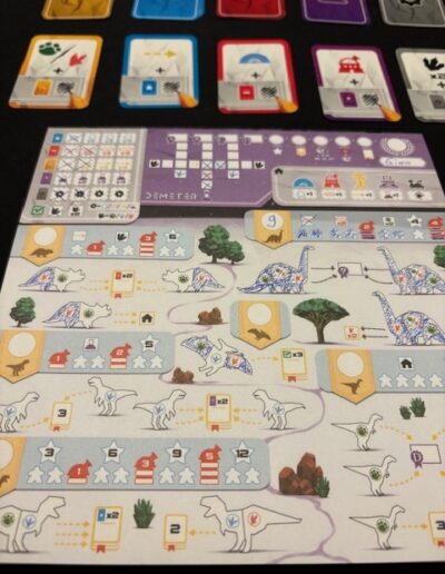 Demeter is a very entertaining flip and write game where you’re busy coloring all sorts of things. There are several possibilities and strategies you have to choose from. You can’t do it all. Demeter plays quite quickly, but it does require some thinking. There’s a competition to see who can discover a complete dinosaur species the fastest (that gets you more points), but otherwise, you’re mainly focused on filling out your own player sheet. I mainly play it solo, just relaxing on the couch for 20 minutes, coloring a few things here and there. It’s more difficult than Clever, for example, but easier than Three Sisters, for example. It’s a real mid-range game. Not too easy—you can’t color everything in as quickly—but it’s very clear (especially after playing it a few times). It’s a fairly short game with many possibilities. The actions are clear and well-developed. In short, a good flip and write game. I give it an 8.