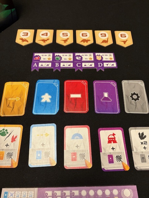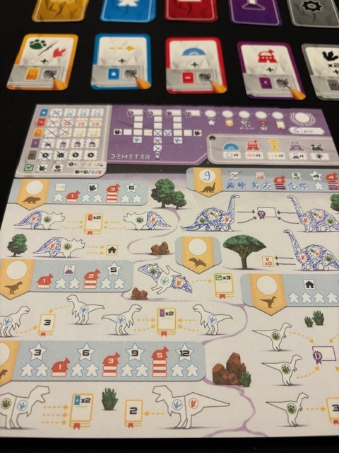Setting up Demeter is therefore very quick. There are 5 types of cards, each with its own color: blue, red, yellow, purple, and gray. Shuffle the 5 decks separately and remove 3 from each deck. Each color now has 12 cards, and those are the rounds of the game. There are 12 rounds. Place the goal tiles and dinosaur species tiles on the table. Grab a pencil and a player sheet.