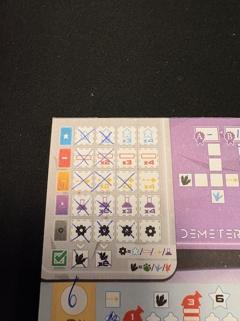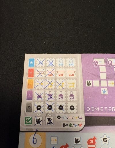 Demeter isn’t a large game; the box contains cards and a large pad with sheets to color in the various options. The cards are good, and there are enough sheets on the pad to play the game often. The symbols are clear.