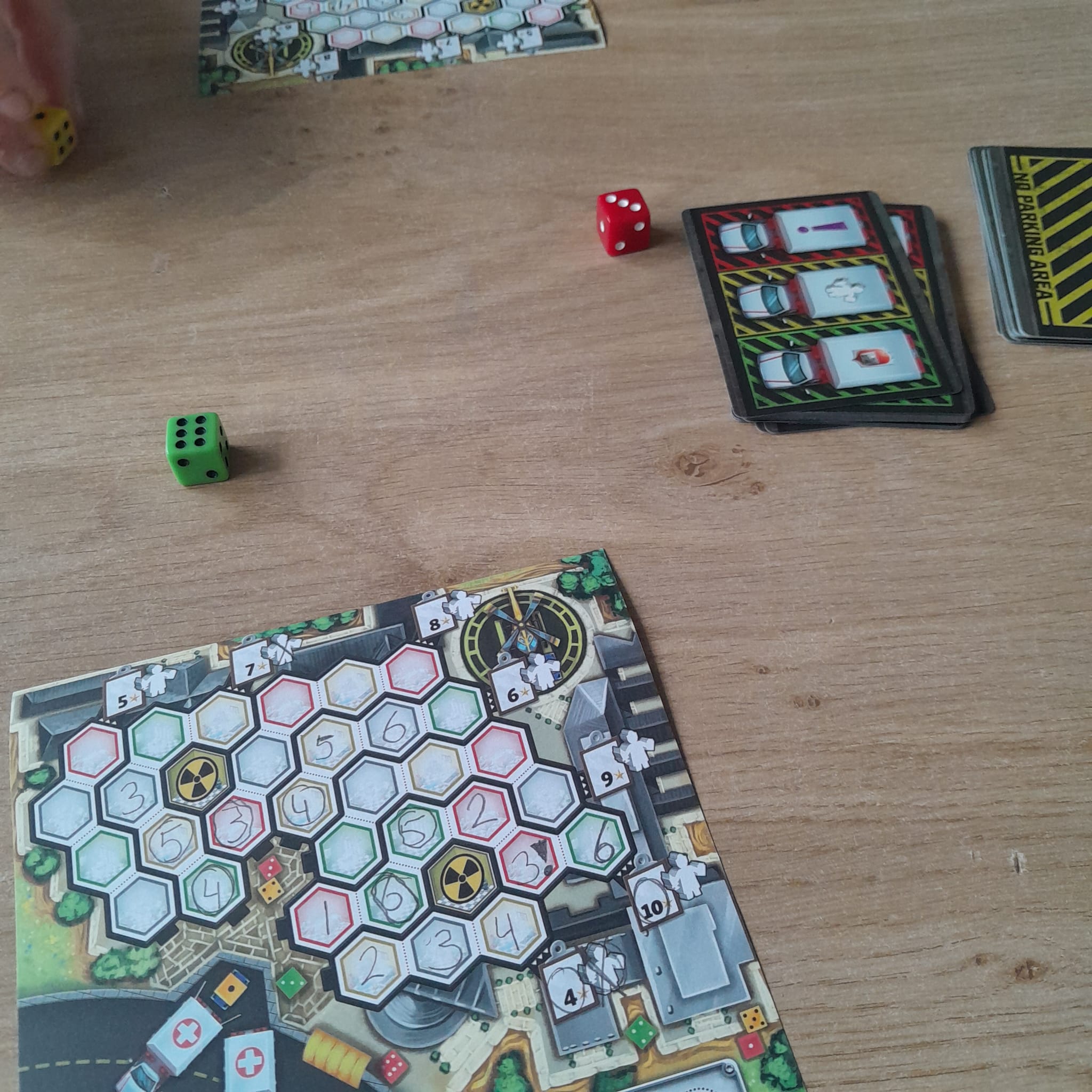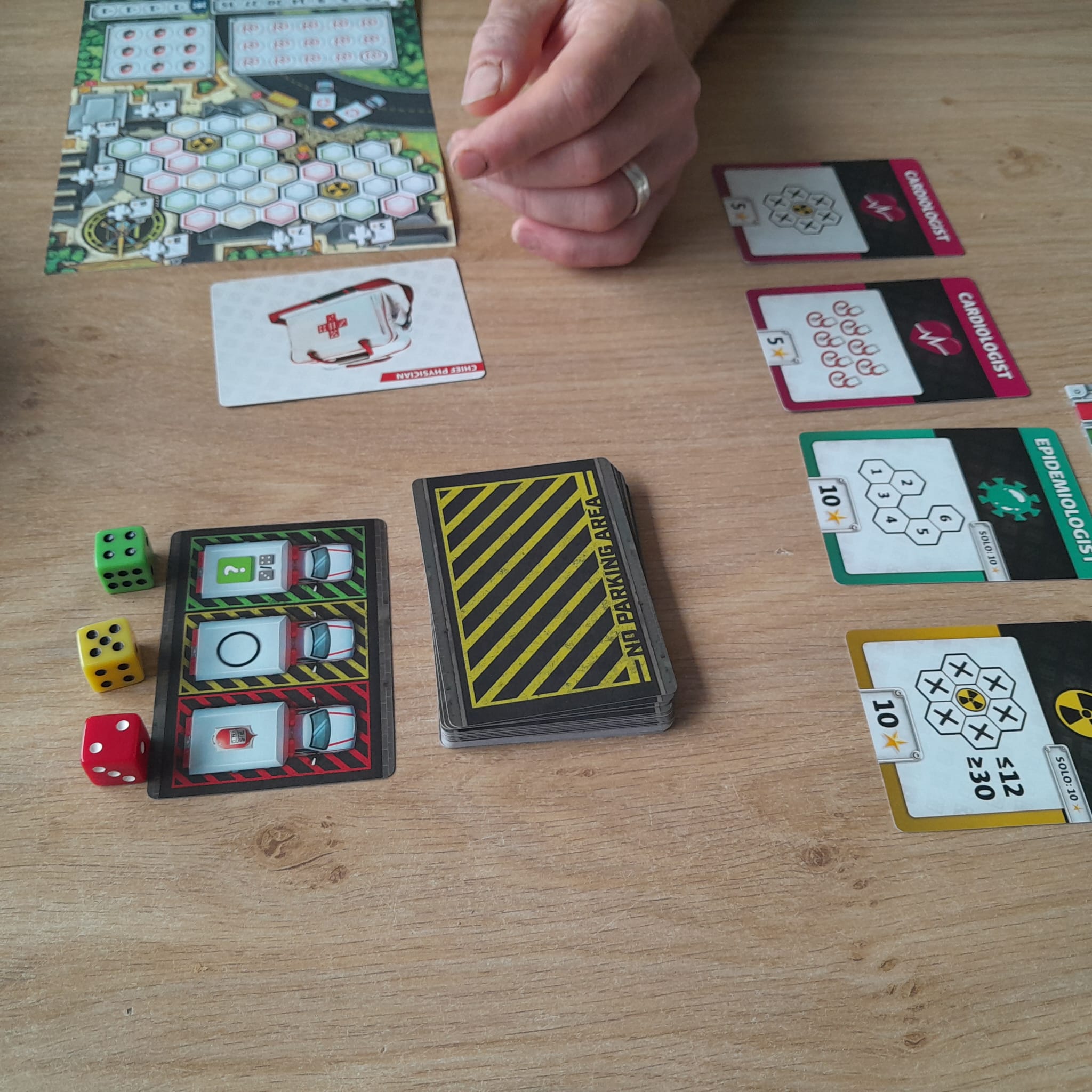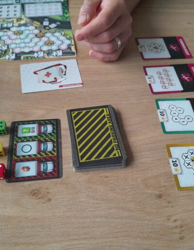 Uiteraard krijgt elke speler een scoreformulier, waarover later meer. Naast het scoreformulier wordt er op tafel een gedekte stapel met ambulance-kaarten gelegd.