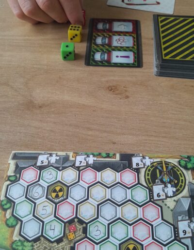 Then the player rolls the dice (also red, yellow and green) representing the patients and places the rolled dice at the corresponding ambulance.