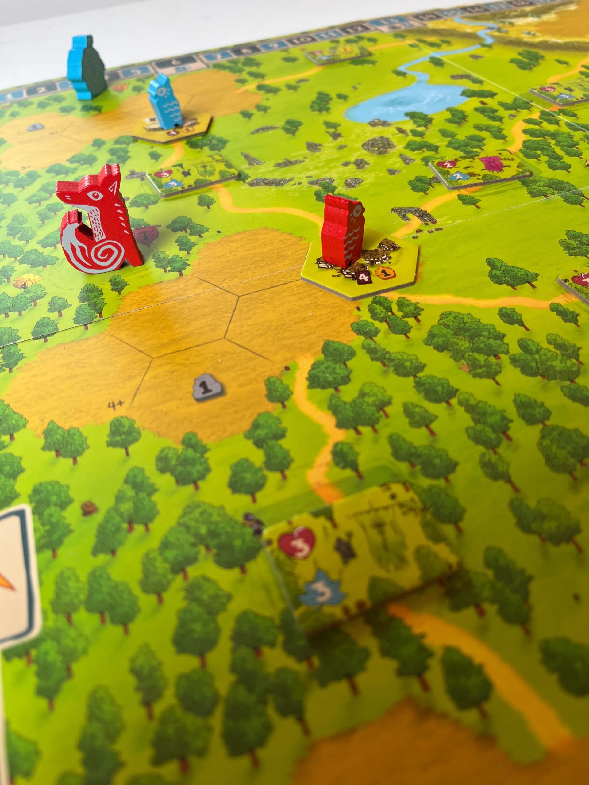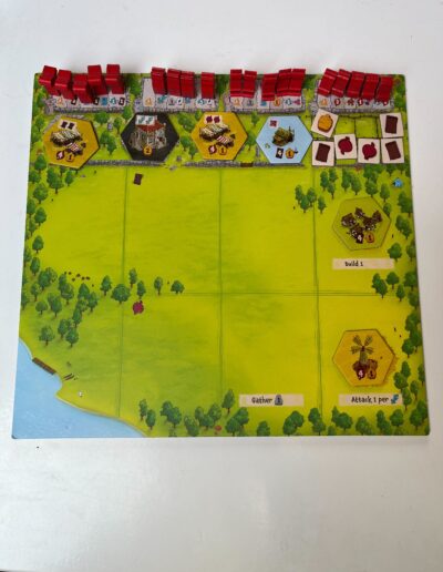 After you have performed all your actions for that turn, the trophies are examined. Trophies are awarded to players if they have reached the end of the war track or if they have fully built a region. You may advance on the war track if you have secured a dangerous area. Each space on the war track gives you certain bonuses such as extra wood or food, but reaching the end of the track earns you a trophy. These trophies yield points, but are also limited. When the last trophy has been removed, the game ends.