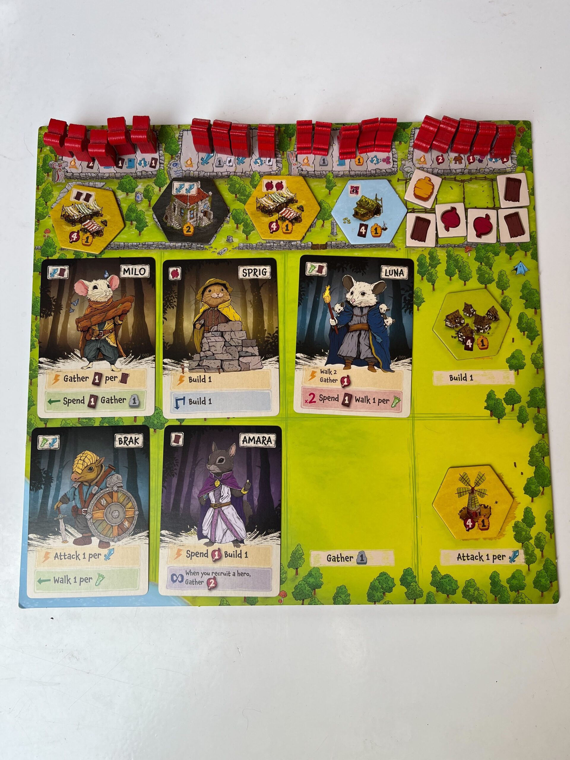 Bij het bouwen mag je ook meteen een bewoner aan het nieuwe gebouw toewijzen van je spelersbordje. Je hebt 4 soorten bewoners (ratten, uilen, konijnen en kikkers) en bij het plaatsen van zo’n bewoner krijg je meteen ook de bonus die die specifieke bewoner met zich meebrengt.