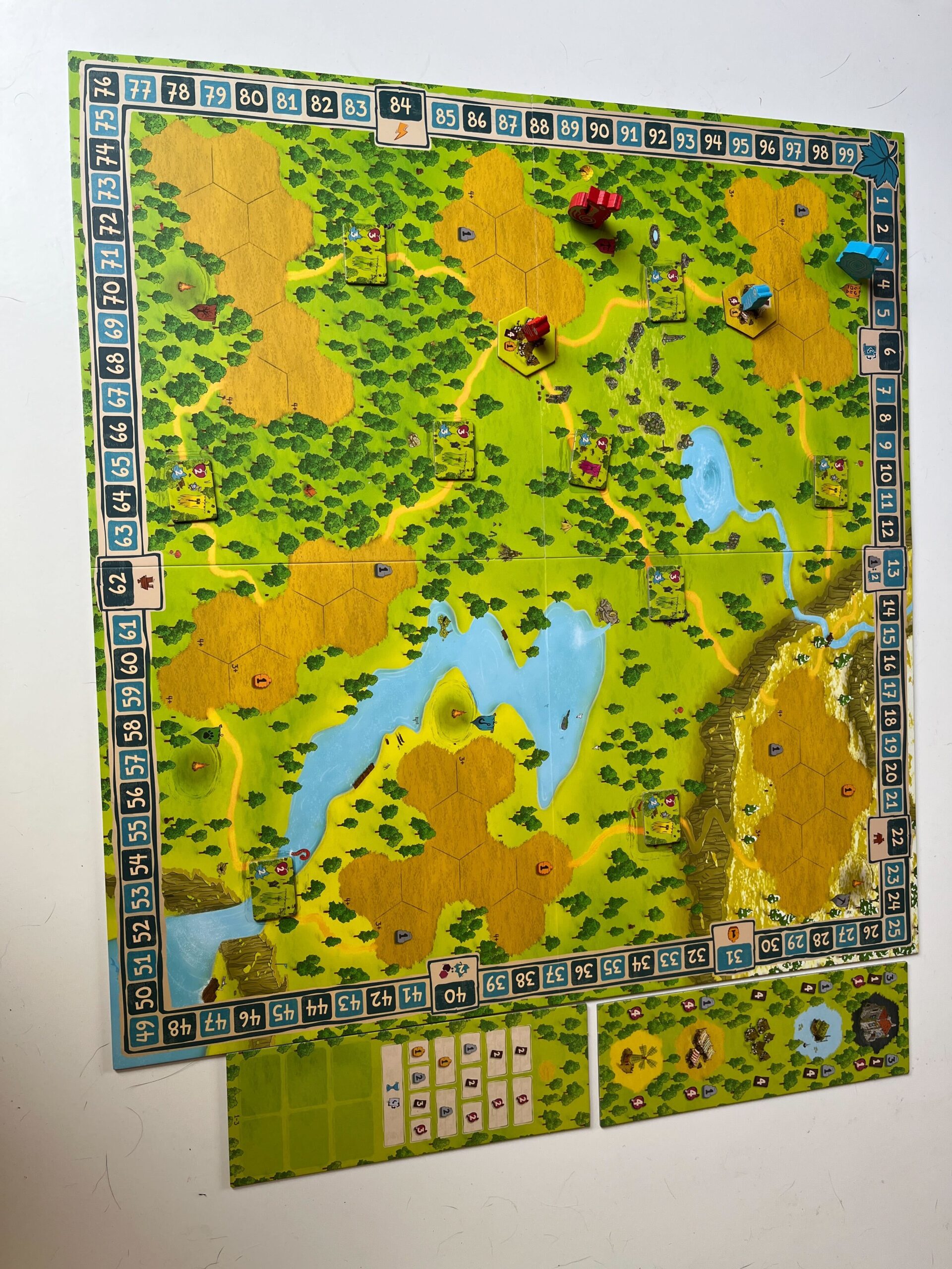 The game is played on the game board representing the Emberleaf forest. You will build, explore, gather resources, secure dangerous areas, and recruit heroes.