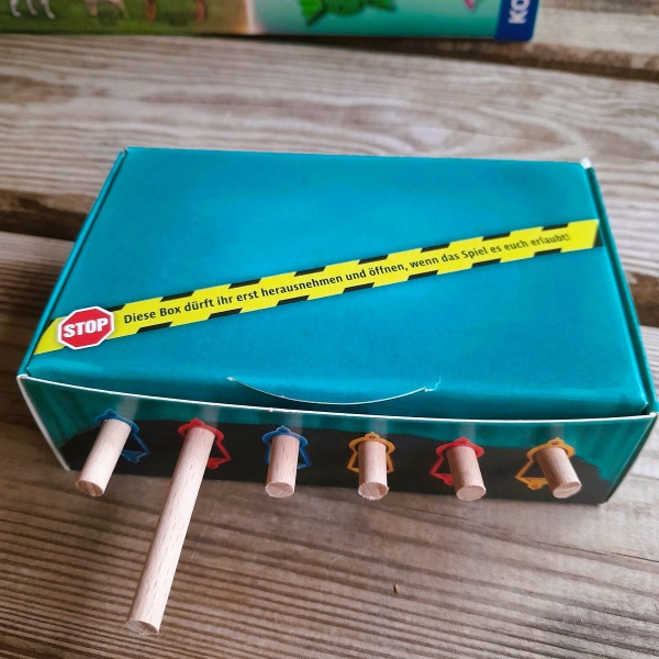 De doos lijkt groot voor de inhoud. Er zit een relatief grote ‘doos’ met stokjes in (geen idee wat dit voor moet stellen!) Maar de rest van de inhoud van de doos is niet veel… De doos had waarschijnlijk de helft kleiner gekund… Maar, als je de doos goed bekijkt, begrijp je wel dat hij (wat) groter is. Ik zie zowel in het deksel als in/op de onderzijde van de doos illustraties, getallen en andere dingen waar we in het spel vast iets mee moeten.