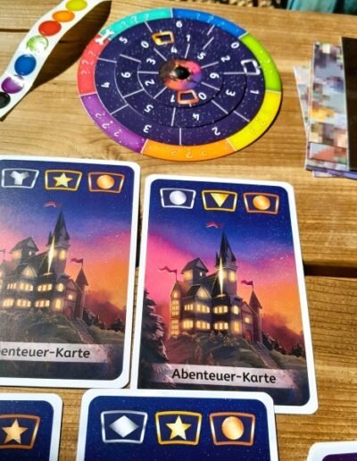 You start the game with the first riddle card. This card contains a riddle. When you think you have solved it, fill in the information on the turntable. Now you can check whether your answer is correct or incorrect. If the answer is correct, find the matching solution card. This card tells you how to proceed; you take the next riddle card(s).