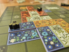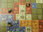 Maar wanneer bordjes bijna even groot zijn… tegeltjes bijna even groot zijn en soortgelijke vormen hebben. Wanneer je deze ook in een ronde legt en je de volgende in de cirkel mag kiezen vanaf daar waar de pion (naaimachine of zon) geëindigd is. Wanneer je bonus krijgt voor het vullen van bepaalde vormen.. in dit geval rijen en kolommen in plaats van een veld van 7×7, dan is de vergelijking wel snel gemaakt. Iets té snel. Het aanvullen van de bijen tussen de rondes, voelt toch als het springen over een knoop op het scorespoor van Patchwork. Als mensen aan mij vragen, wat voor spel is Flower Fields, dan zeg ik al snel: Een soort Patchwork, maar dan met bloemen en bijen. En je kan je natuurlijk afvragen of dat gewoon héél slim is (want hoeveel mensen houden er wel niet van Patchwork (ook ik)), of dus jammer? Een die hard fan zal dat wellicht helemaal niets uitmaken! Koop dit dan vooral. Je gaat er veel lol aan hebben! Maar persoonlijk had ik de behoefte om verrast te worden. En los van de mooie vormgeving werd ik dat gewoon niet genoeg. Jammer! Het voelt als meeliften op een populair mechanisme, maar daarbij de plank of eigenlijk de spijker nét mis en dus niet op zijn kop slaan.