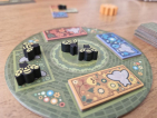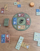 In the middle, place the shared board with four of the two-piece pieces and two-bee pieces on it. Around the shared board, place the Tetris tiles, which represent flower fields. The number of tiles depends on the number of players. Place the marker (the sun) between any two tiles. Once that’s done, you’re ready to go.