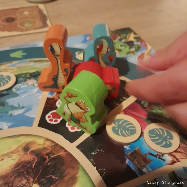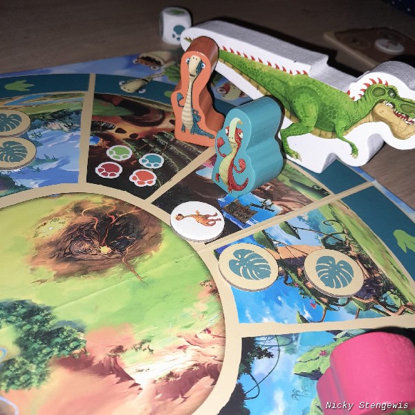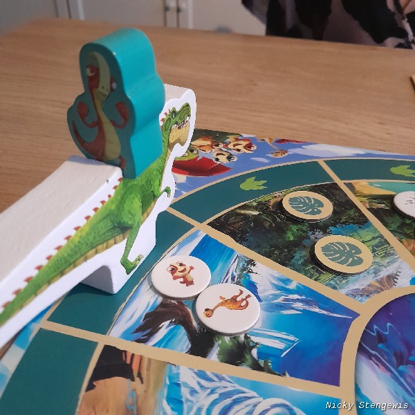 Je kunt namelijk met hem meeliften. Dit mag alleen in je eigen beurt. Als de gigantosaurus in hetzelfde gebied staat als jij, kun je opstappen. Dit kan ook ná het dobbelen zijn.