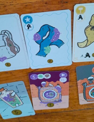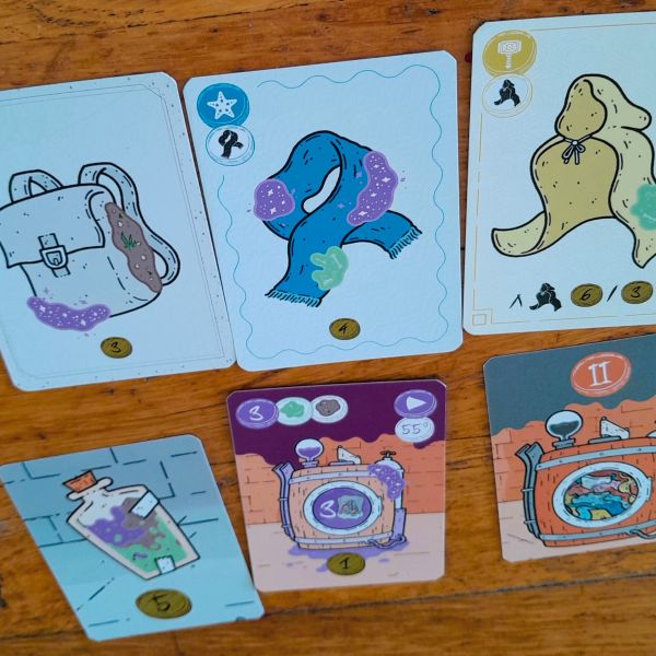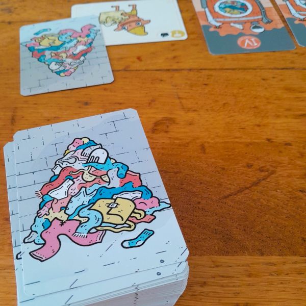 Although I think Goblin Laundromat is suitable for everyone, it is not a ‘simple’ game; in the sense that it has many fun elements. The drafting is a fun mechanism, but especially the card you are dealt at the end makes it extra fun. The same goes for the fact that your unwashed clothes are left in the laundry basket for your next wash. All those purple stains you thought you washed away in round 3 are great fun, but in round 4 you suddenly find you have a green washing machine…