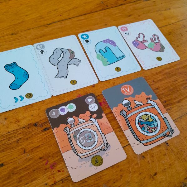 Players receive points for completed washing machine cards and points for clean laundry in the same color as their own goblin.