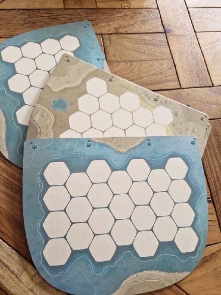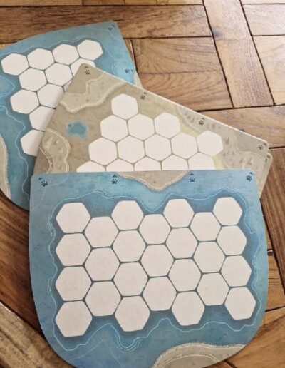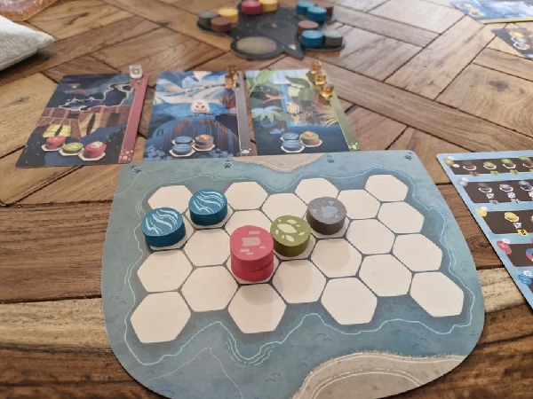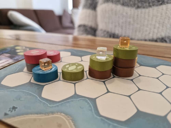 Blue is the water and the tiles form rivers and lakes. On the beige side of the board, you score with the longest possible river consisting of contiguous blue tiles. On the blue side of the board, you try to create islands as cleverly as possible by closing off parts of the area with water. Each individual area scores five points.