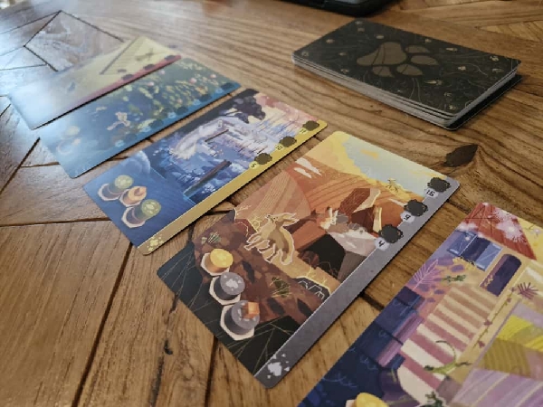 I am a fan. I can really enjoy it when a seemingly very simple mechanism turns out to have so much depth. The large amount of (more than beautiful!) cards continuously creates a different game, which, especially when the nature spirits are also in play, always provides new challenges. Especially since you will have to make do with the stones you get in front of you. It is a constant balancing act whether to strategically place stones based on the count of the board, or based on the assignments you already have or that are at hand. It is a nice puzzle to be able to combine these assignments and obtain as many of the cards as possible with as few stones as possible, where you also have to take into account the number of times you need to make a pattern, but also want your landscape/board to be worth something on its own. And where placing the gems on top of the tiles can also be a real handicap, as it makes some combinations and building on mountains impossible. There is a challenge in optimizing the possibilities you get. Combining is not at all as easy as it seems. And that makes the game to itself a little less sweet than the design might lead you to believe.