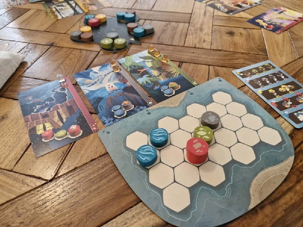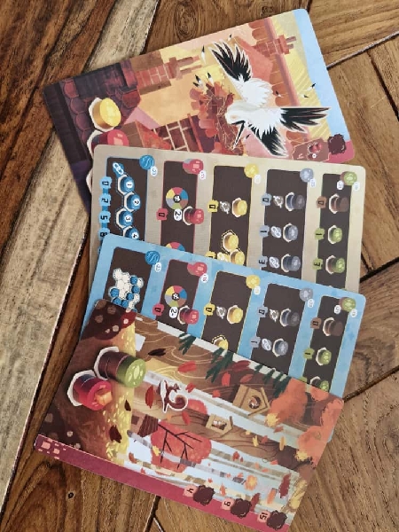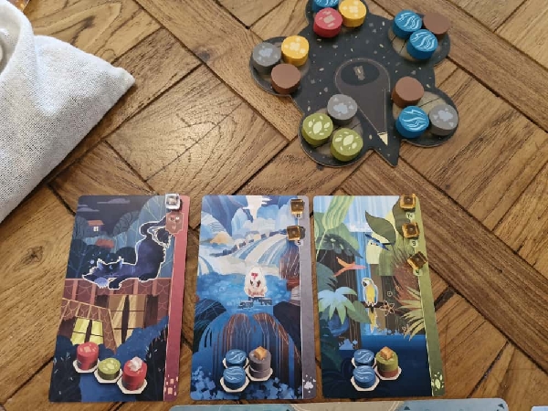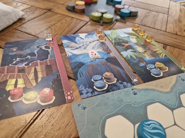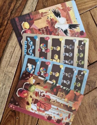 Can we please talk one more time about the beautiful design. I don’t have very many games in my cabinet myself that Maëva da Silva has had her share of. But a look at her portfolio tells me that this is definitely one of her masterpieces. It’s an excess of color that never feels like too much or bombastic or shortchanges the game. The beautiful natural world she manages to sketch makes this game transcend abstraction to then still take you into a beautiful fantasy world without becoming too fairy-tale or fairy-like, as a lot of nature games do. (Which, by the way, I don’t mind at all). There is a wonderful harmony in this as well that is exactly right for me.